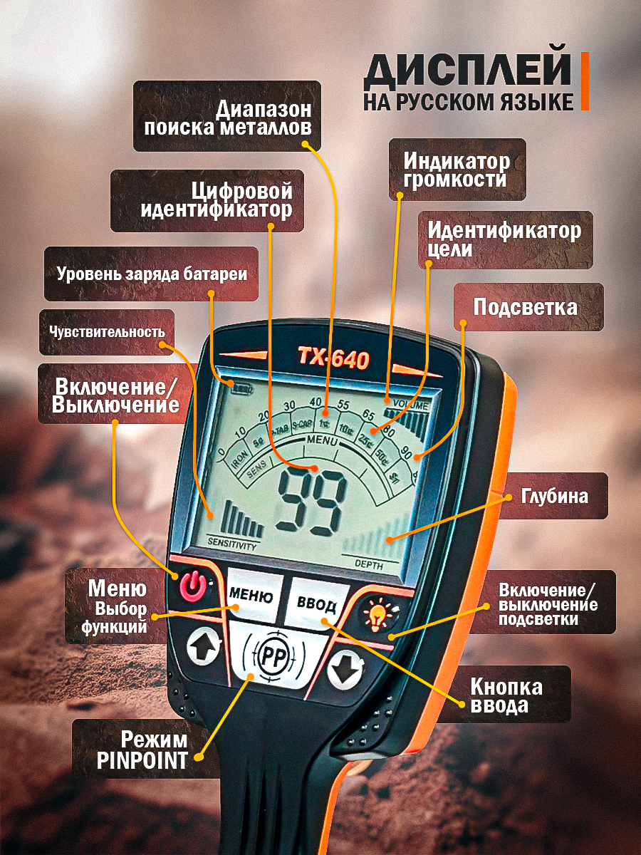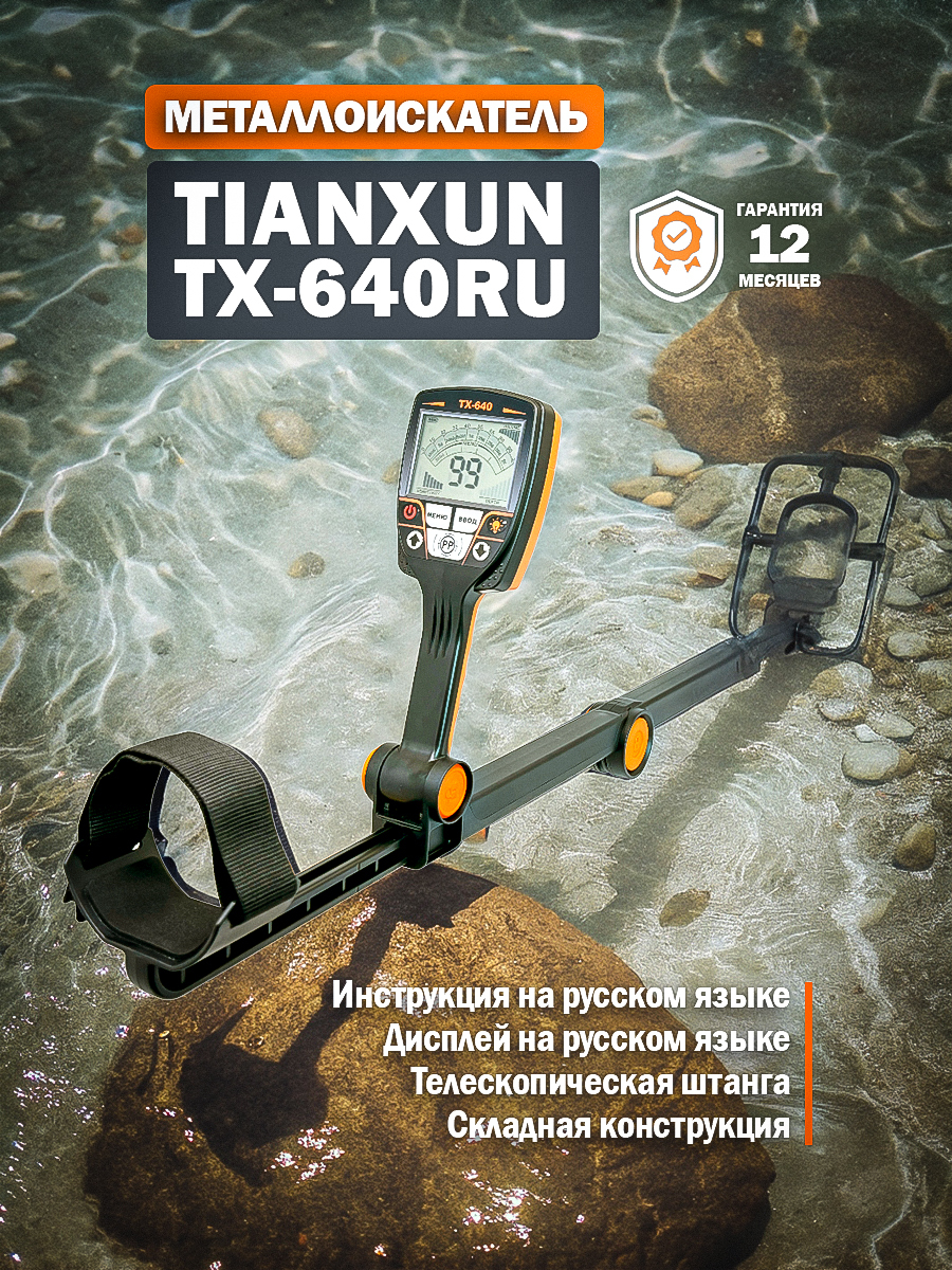 Грунтовый металлоискатель TX-640RU – прибор для обнаружения металлических предметов. Подойдет начинающему искателю. Детектор оснащен водонепроницаемой катушкой 10х7 дюймов с защитой по стандарту IP68. Есть два режима работы – металлический и дисковый. Водонепроницаемая поисковая катушка позволяет искать металлические предметы под мелкой водой. Информация о месте залегания цели выводится на встроенный ЖК экран, на нем же отображаются актуальные настройки прибора. Управление осуществляется с помощью кнопок. Длину стержня можно регулировать как удобно пользователю. Питание осуществляется от 2 Крон.